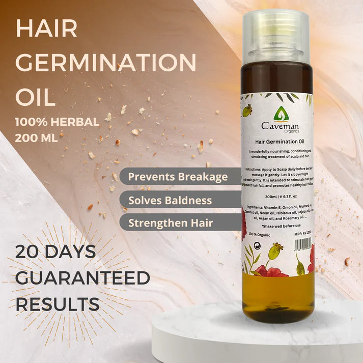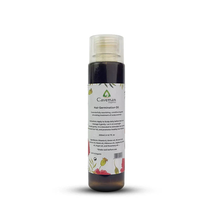 Unlock the secret to fuller, thicker, and healthier hair with Caveman Organics’ Ultimate Hair Germination Oil. Formulated with a unique blend of pure, organic oils and herbal extracts, this potent elixir is designed to stimulate hair growth, nourish the scalp, and reduce hair loss. Our germination oil is perfect for all hair types, revitalizing your hair from the roots and ensuring you achieve your desired luscious locks.